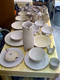 The greenware has been waiting, and finally, there’s enough to fire. This weekend, if all goes well, I plan to fire a load. This firing will include a dozen mugs, several plates and bowls, a couple bacon nukers, and some fun stuff.