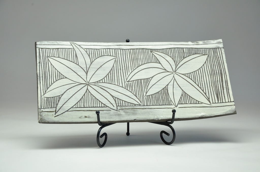 In this batch, I had a few pieces which had a white slip with decorations. The recipe for the slip worked nicely, and the results were pretty nice, at least to my eye, for the first try. Definitely more work with this slip coming in the future. Here’s the recipe…